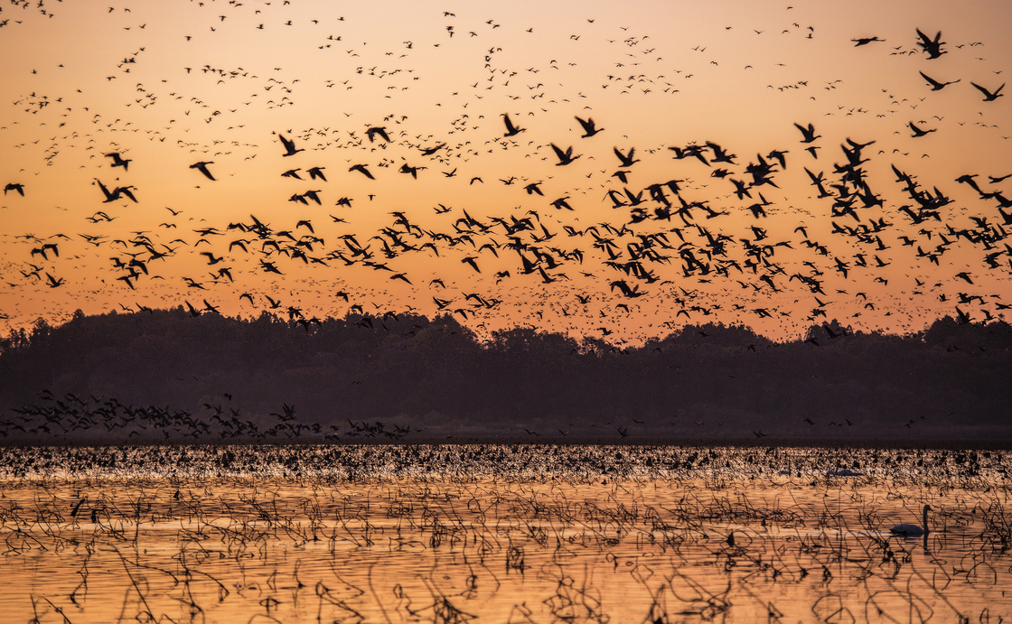 水田の稲穂が刈り終えられる頃、湿原には渡り鳥たちの声が満ち始める。