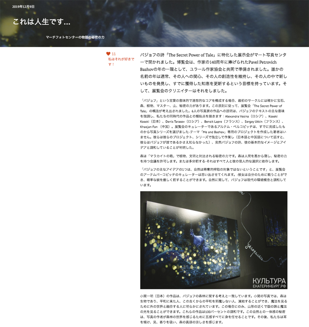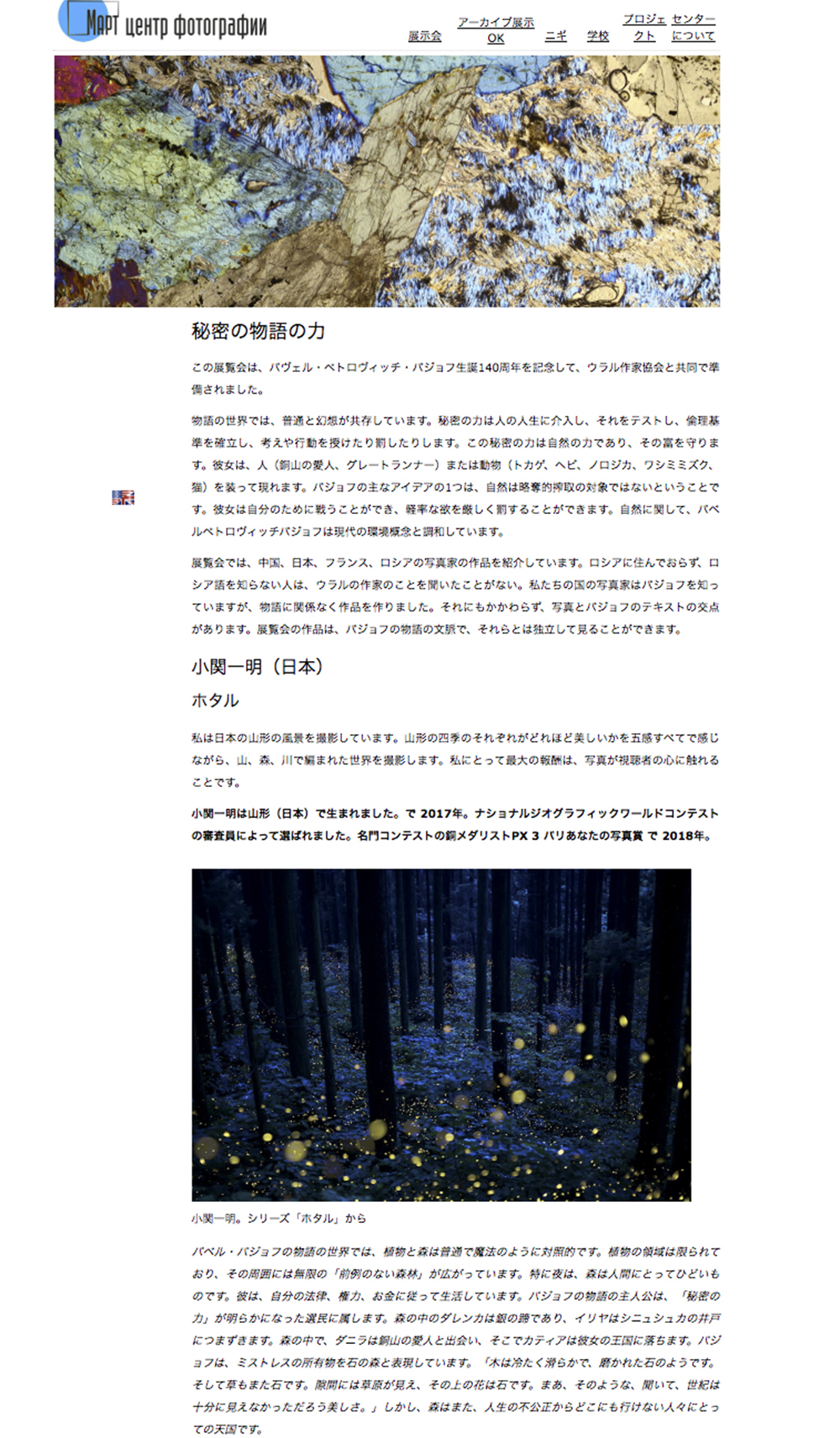 このギャラリーには、中国、日本、フランス、ロシアのアーティストが作成した写真が含まれています。国際的なアーティストは、ウラルの作家、バショフに精通していません。さらに、ここに展示されているロシア人アーティストの写真も、ロシア人の間で彼の作品に広く親しまれているにもかかわらず、彼の物語とは意図的に関係なく撮影されたものです。このギャラリーの写真は、バゾフの物語のレンズを通して解釈することも、独立した芸術作品として解釈することもできます。