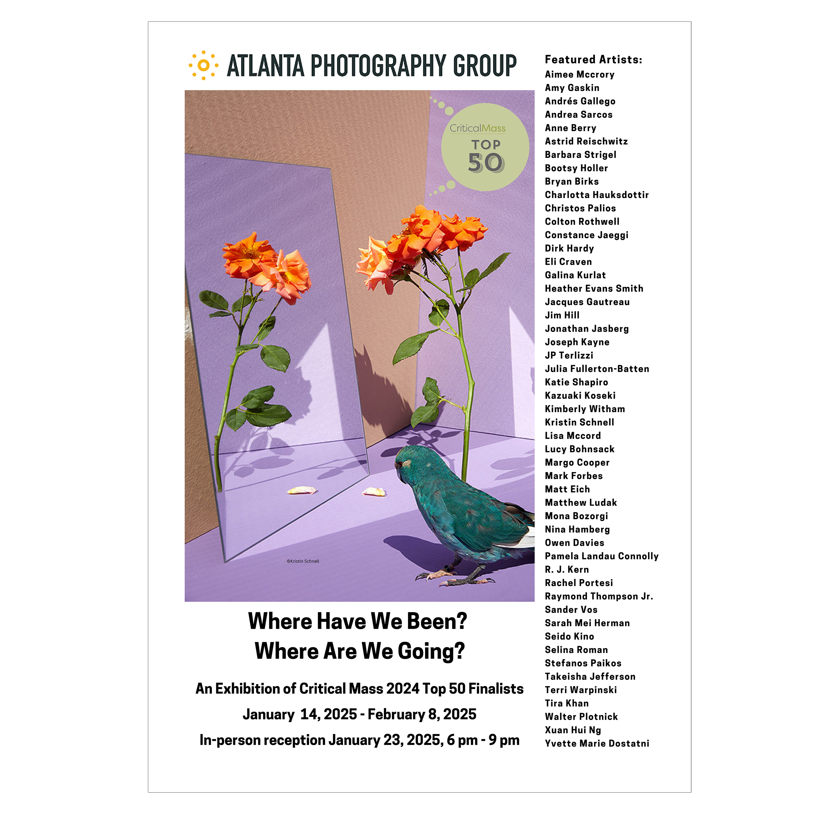 今年の展示会は、 「私たちはどこにいたのか? 私たちはどこへ行くのか?」と題され、Critical Mass 2024 Top 50 の各アーティストによる画像が 1 枚ずつ展示され、Photolucida のプログラム ディレクター、Polly Gaillard が慎重にキュレーションしています。